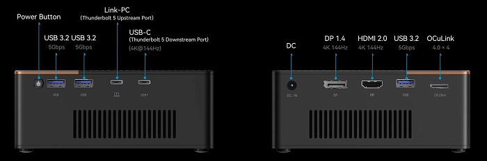 К маленькой коробочке размером 140 × 100 × 54 мм можно подключить как три USB 3.2 Gen1 Type-A, HDMI 2.0 и DisplayPort 1.4, так и Thunderbolt 5 и OCuLink, которые необходимы для соединения основной системы с внешней видеокартой. Такая универсальность позволит повысить производительность у любого современного устройства, но, если есть возможность, то лучше использовать OCuLink. К слову, тот же TB5 может передавать до 100 Вт мощности, если это необходимо.